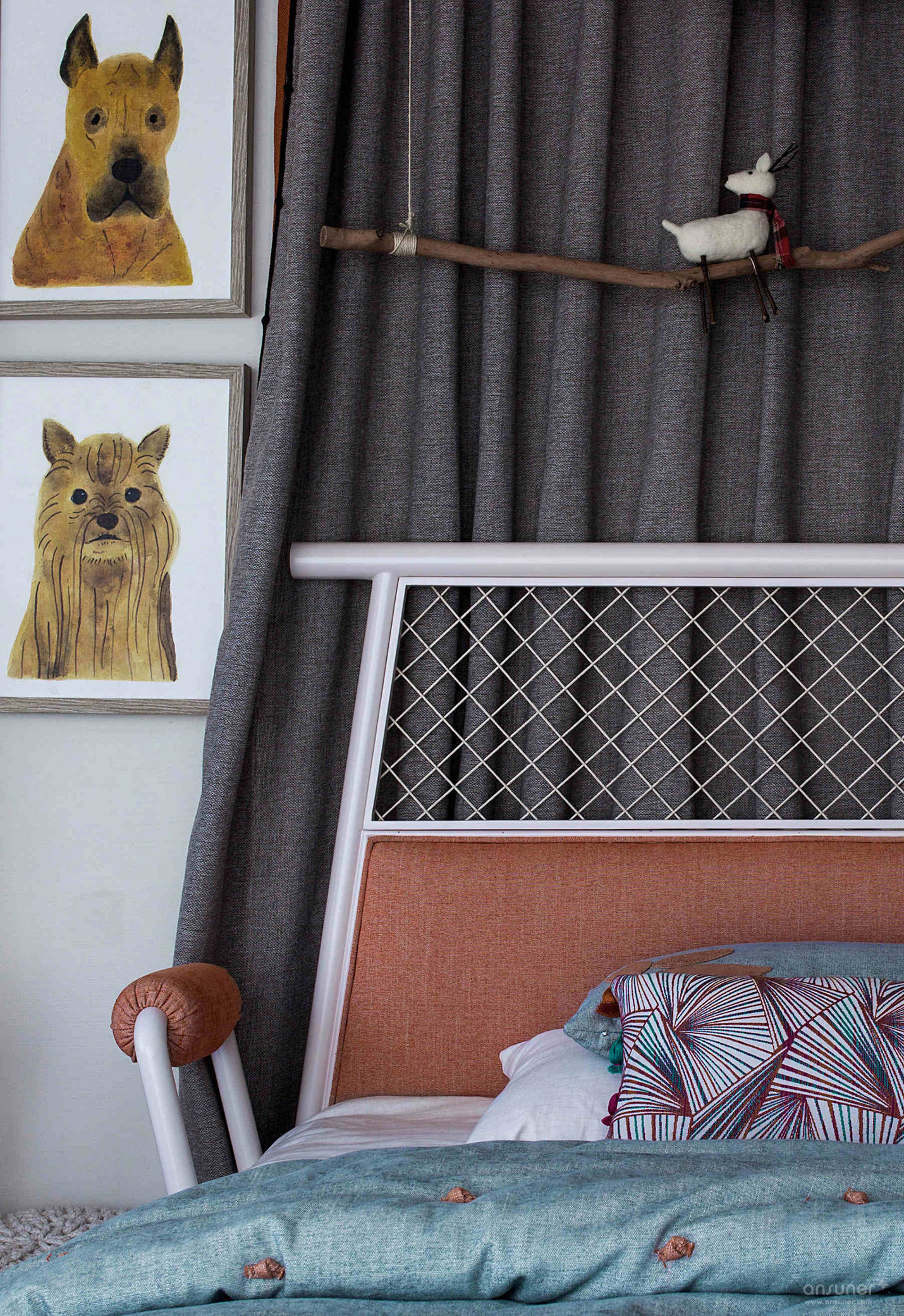 儿童房:儿童房的设计则更具现代气息和纯真色彩。空间以浅色为基调,以麻布灰色建构起别致创意的布艺背景,橙色的滚边设计,与窗帘及天顶灯罩的橙色相互呼应,清新与活力自然流露,未经修饰的一茬树枝别开生面地悬于其上,枝头伫立着鸟儿,啾啾声里与落地窗外的自然绿植相映成趣。