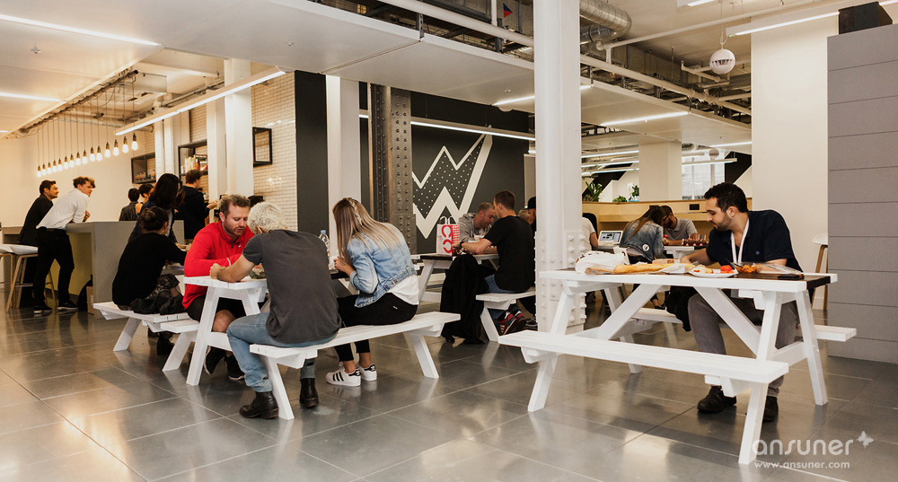 ▼餐厅,这里是整个联合办公社区的社交中心,一座大型吧台、还有黑白搭配的时尚野餐桌,营造轻松惬意的聊天氛围;