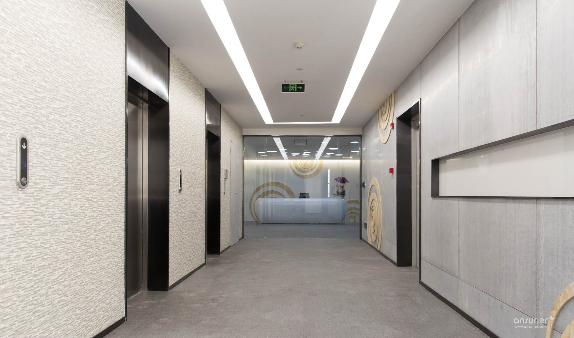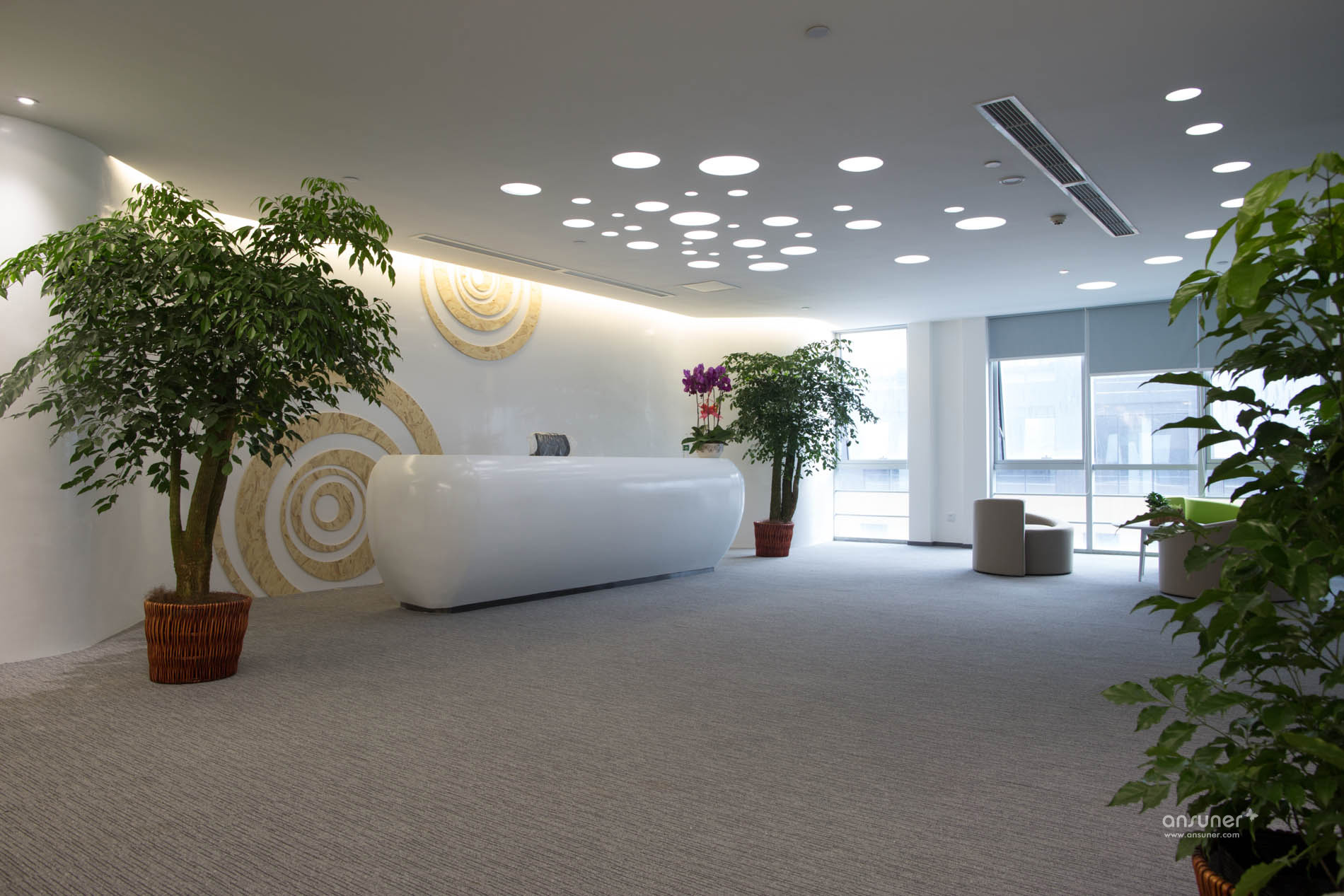 接待台后面的装饰墙上镶嵌着由小及大的圆环,彷如那神秘幽深的银河,是探索的方向。类比的“星空”、“银河”,在形式上做到了既不直白同时又能反映企业相应的特点,增强了对于米兰体育app的体现。