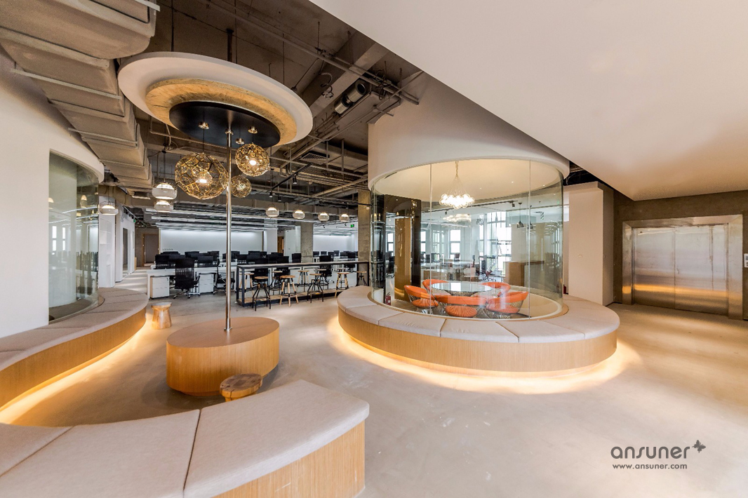 圆弧形的会议室和休闲区是本次设计的核心,也是凸显共享和交融的重点,通透的玻璃会议室和无遮拦的休闲区设计形成完美的结合。休闲区的设计得益于当今的科技发展,移动式办公成为可能。标注办公桌渐渐转化为共享办公桌,多元化的移动办公方式提供了更丰富的选择。个人固定办公桌时代已经成为过去,员工要考虑的事情就是选择哪里更合适今天的心情、今天的工作。