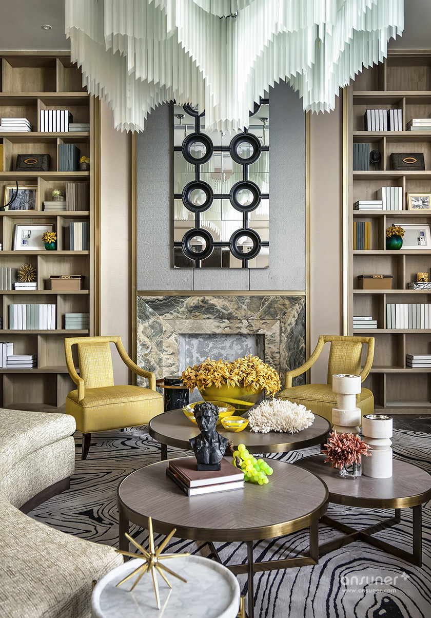 聚会厅的空间中,温润的黄翡色泽介入,材质的混搭与精致的工艺形成一场精心的铺排,简洁有力的设计语言,抽象的艺术画与精致雅趣的饰品在同一空间并置。