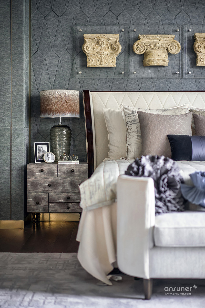 主卧休息室主调为灰色,整体空间庄重内敛,铜质饰品的介入,形成一脉形成的艺术感。