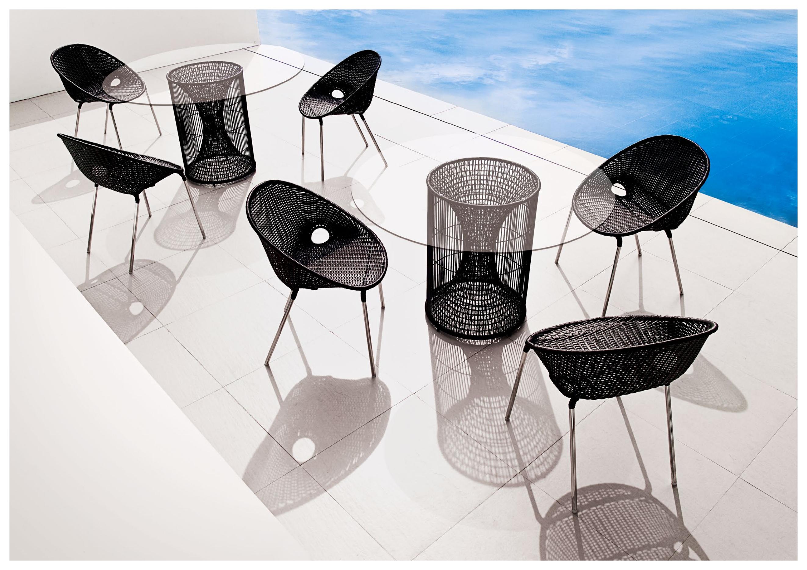 小酒窝扶手椅上的标志性凹痕为户外空间增添了一份微妙的厚脸皮。这些可叠放的椅子由聚乙烯和不锈钢制成,有青铜色。