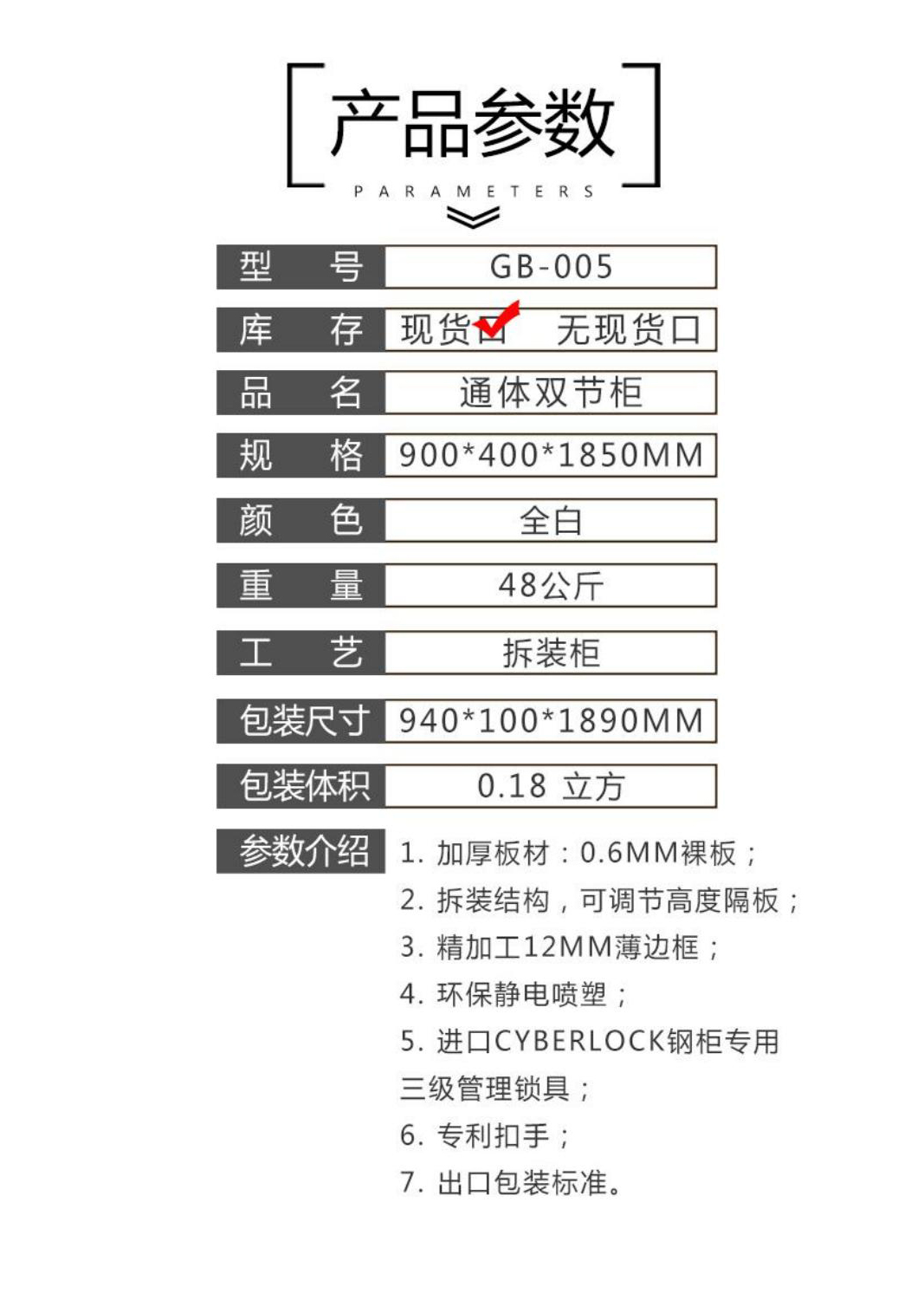 1加厚板材:0.6MM裸板 2.拆装结构,可调节高度隔板 3精加工12MM薄边框; 4.环保静电喷塑; 5进口CYBERLOCK钢柜专用 三级管理锁具; 6.专利扣手; 7.出口包装标准。