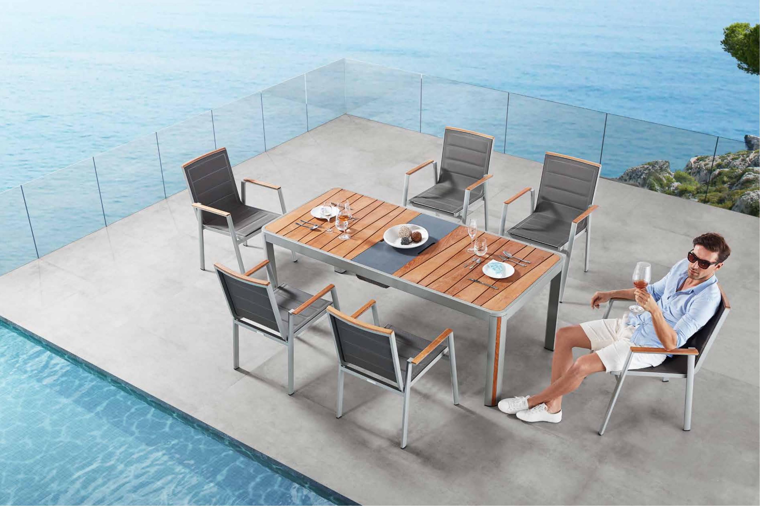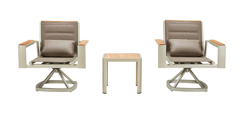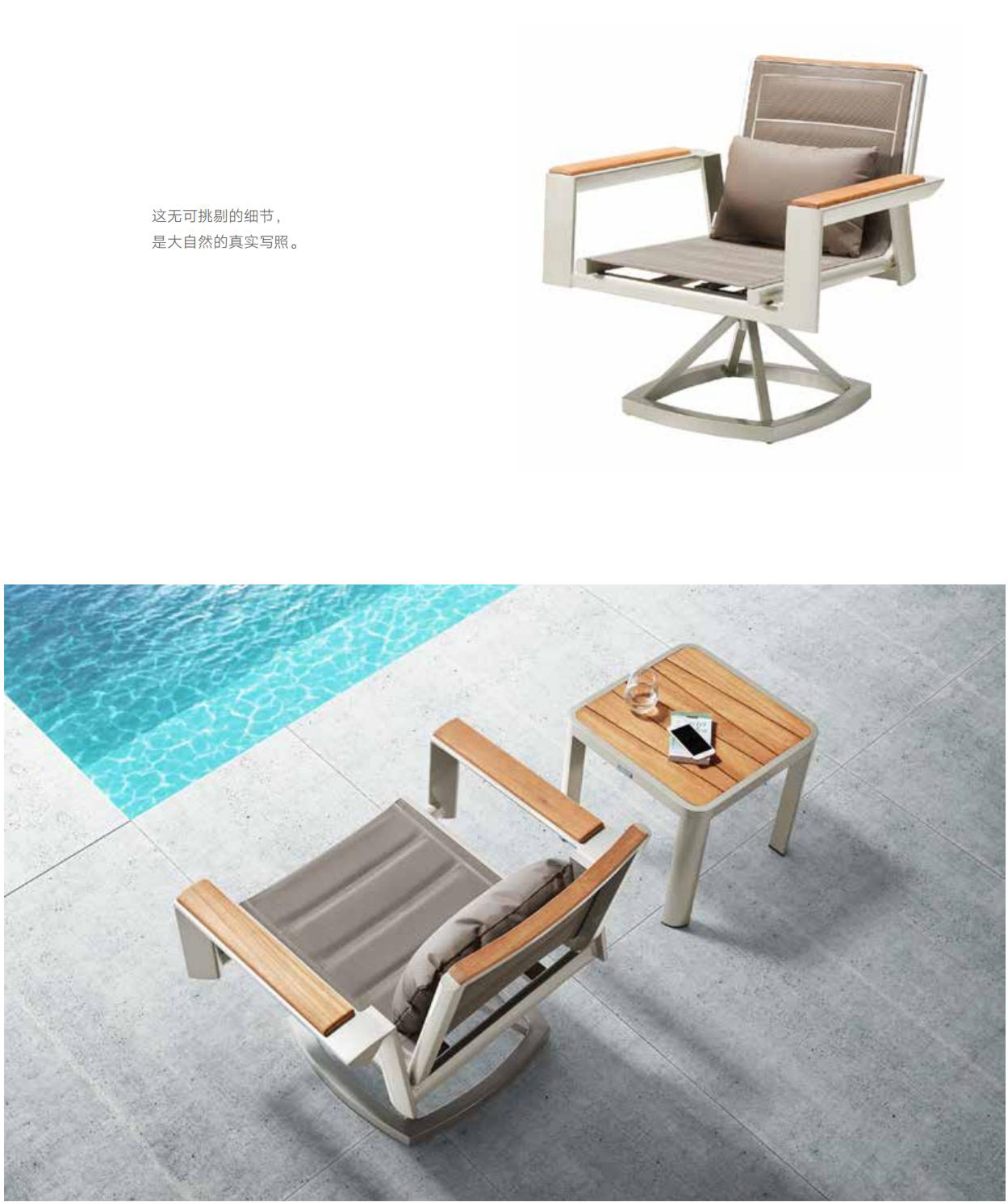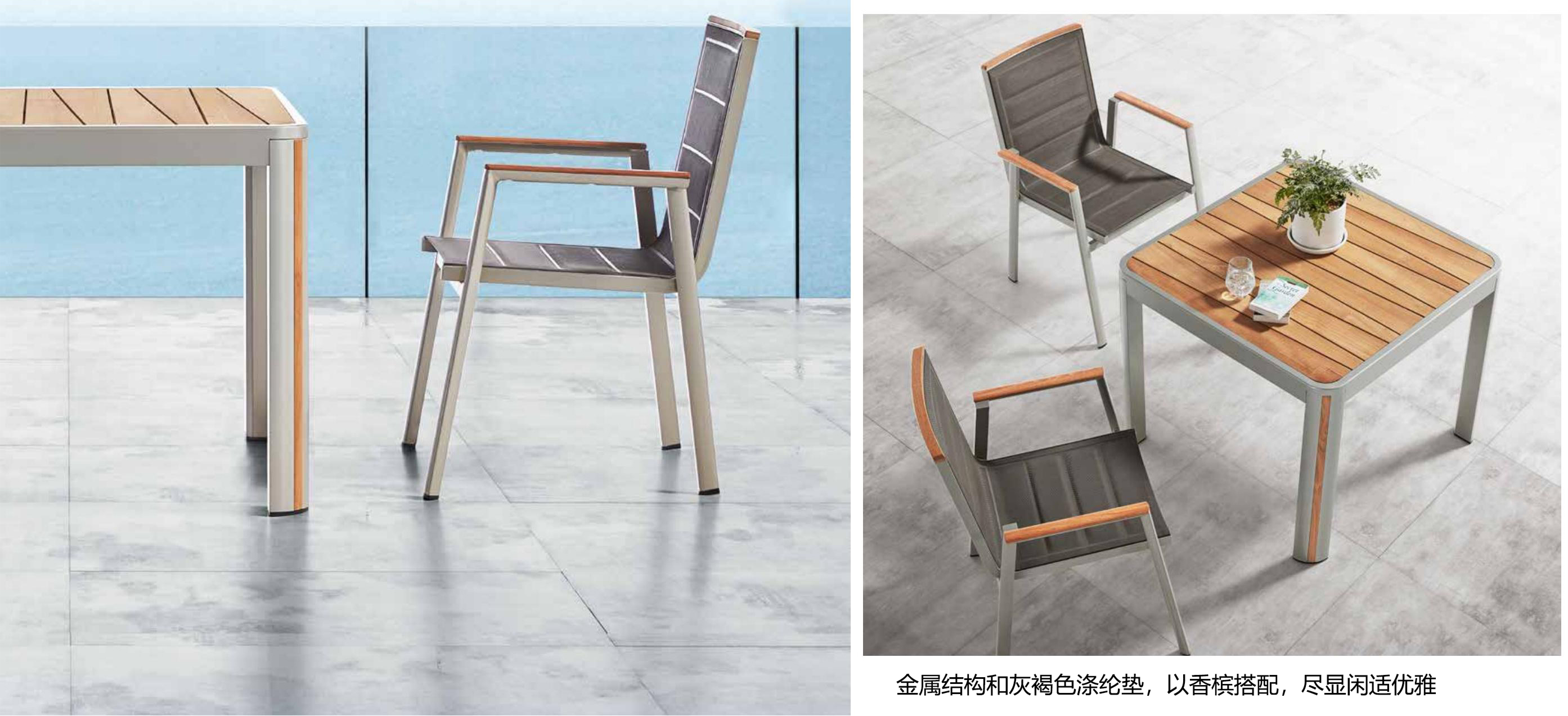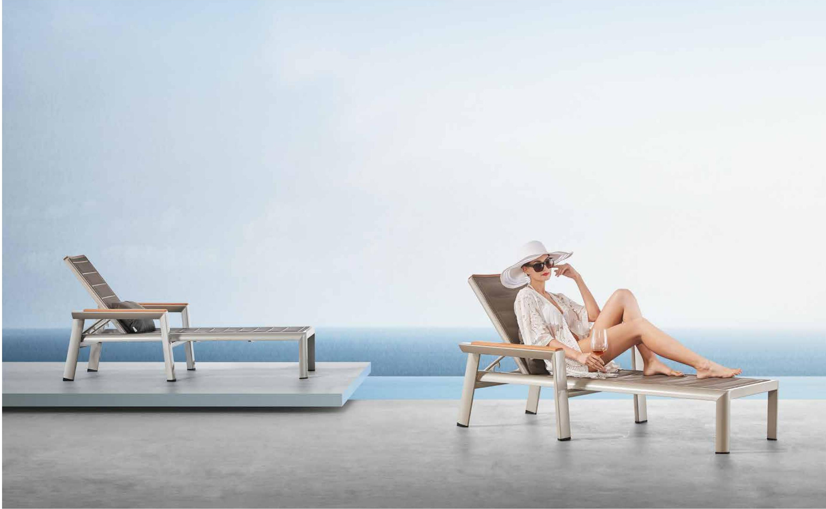 设计灵感:1970年AMC V8 肌肉车,经典中的经典 “经典”---设计灵感是经典中的经典,整体铝镁硅合金外框像极了肌肉车的构造,充满力量; “完美”---横向的热熔缝制处理和竖向的精密线条做点缀,完美结合 “高级”---外框架表面喷涂高级香槟色AkzoNobel牌粉末,坐背体采用双层夹棉原理,令产品立体有充满动感 “多元”---系列产品配套齐全,沙发、餐桌椅、转椅、躺床、高吧餐桌椅、飘床等,满足您的不同生活需求 瑞士手表有极高精准度,而日内瓦系列由此得名。人们一提到户外家具,往往联想到更多的是藤艺的或者是铸铝的款式,如今随着现代设计潮流的繁荣,金属外露的设计也变得愈来愈紧俏。 日内瓦系列的每个产品细节,就像手表一样,都做到了极致,令人无可挑剔。纯天然柚木扶手和桌面,触感真切,随时随地感受大自然。不规则的木板排版,让人耳目一新,记忆犹深。坐背体采用双层夹棉原理,热熔的缝制处理令产品立体又充满动感。 日内瓦系列选用高级香槟色粉末喷制金属主体,灰褐色特斯林面料制作软体结构,当香槟味遇上Taupe色,仿佛陷入纯情,一幕幕经典的爱情故事再次映入眼睑。 日内瓦系列配套有沙发、多人位餐台餐椅、高吧台和吧椅、组合沙发、旋转休闲椅、沙滩躺床及飘床,应有尽有,满足您不同的生活需求。