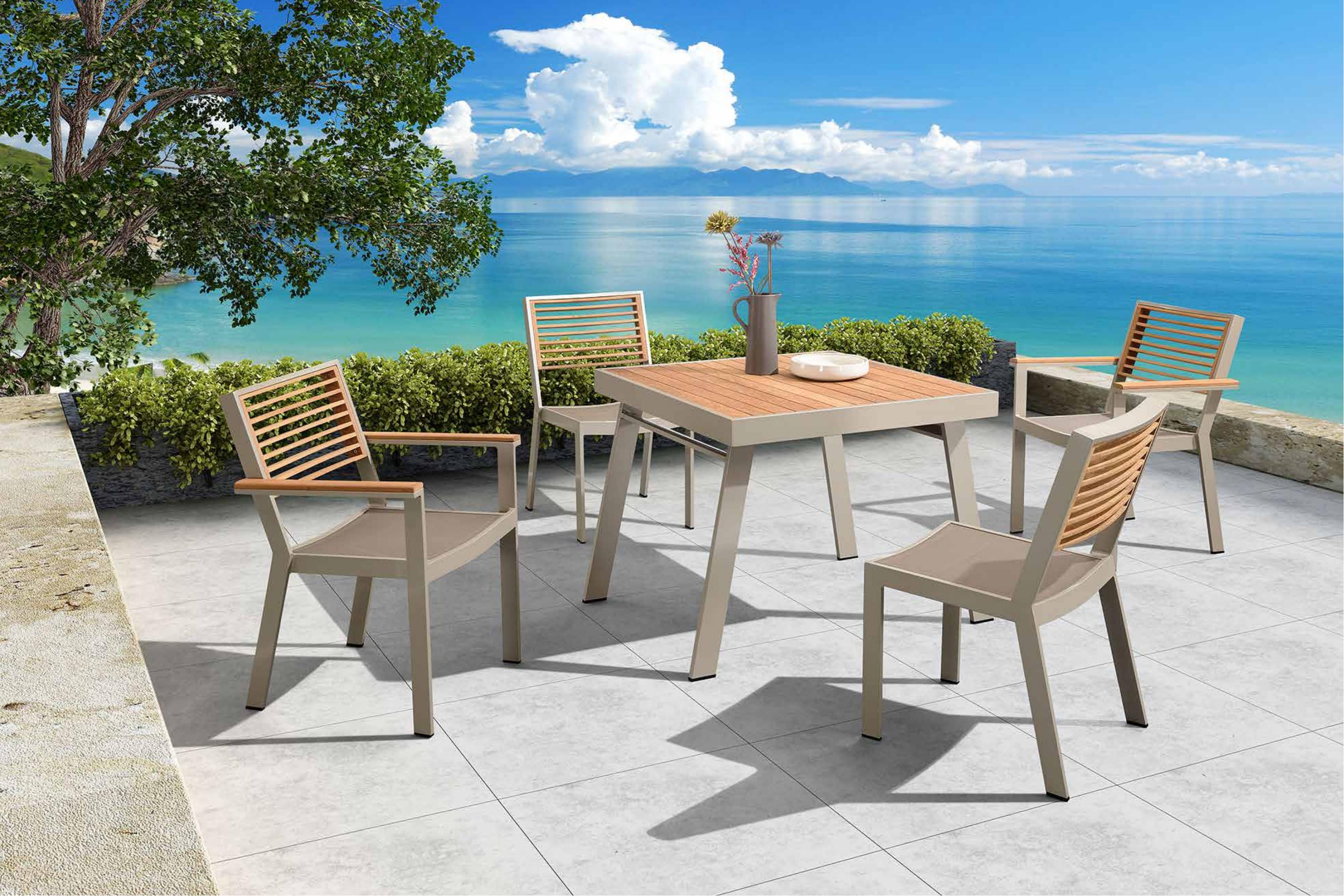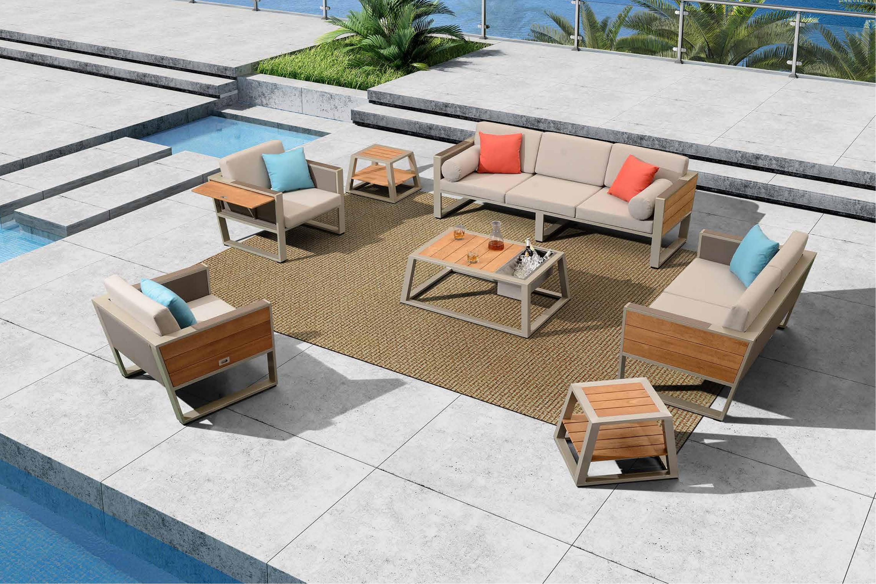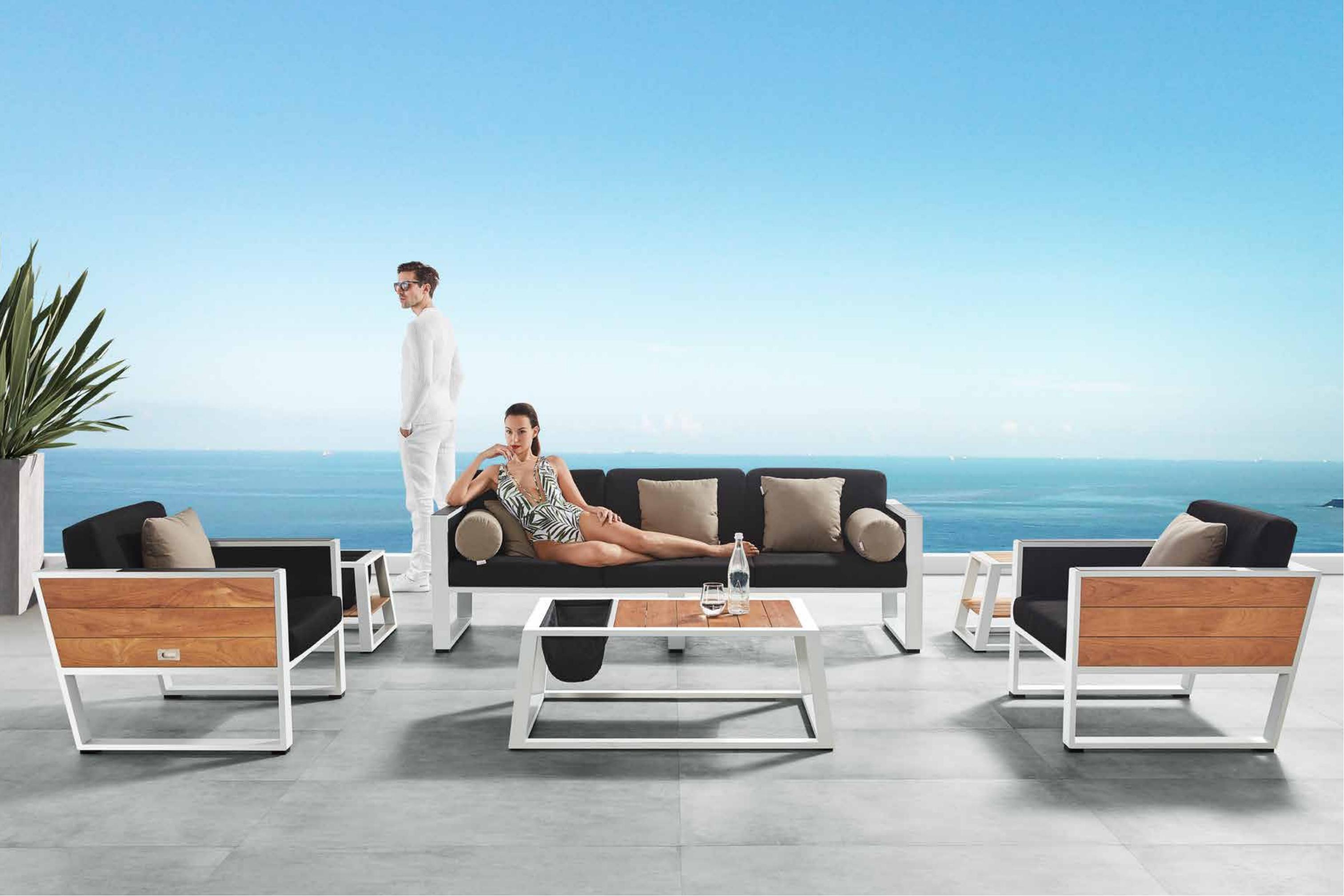 设计灵感:豪华游艇 “贵族”---极具质感的金属外框搭配天然缅甸柚木,像游艇一般体现独有的英朗贵族气质; “功能”---沙发扶手侧板具备半自动可收放功能,单向阻尼系统增加产品安全性和静音性,像游艇夹板一般给客人带来多一份享受的空间 “精品”---约克系列自面世以来一直是悍高最受青睐的设计之一,引爆全球。 约克户外休闲系列打破常规的户外家具设计,不再是纯粹的藤编风格。由天然柚木、舒适特斯林、及白色外框巧妙搭配,衬托出简约但却充满质感的视觉效果。 天然柚木配以优质柔软海绵,给人们带来足不出户即可享受到的舒适户外休闲生活。沙发右边侧板采 用半自动可收放的柚木侧板,使产品空间利用最大化;茶几部位增加冰桶,提升用户户外体验。 约克户外休闲系列自面市以来一直是最受青睐的设计之一,全球共享。现代设计元素的应用,令产品充满青春 阳光的气息。与现代建筑风格融为一体的立体感,York 是全球各大豪华酒店的不二之选。